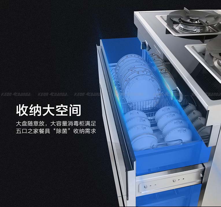 下方搭載110L黃金容量消毒柜,復(fù)式方程隱形導(dǎo)軌設(shè)計(jì),有效防止導(dǎo)軌變形,取放方便,清掃方便,同時(shí)滿足五口之家餐具“除菌”收納需求,“碗”美收納,餐具各就各位,上下層3D立體消毒烘干設(shè)計(jì),有效防止餐具滋生細(xì)菌產(chǎn)生二次污染等風(fēng)險(xiǎn)。
