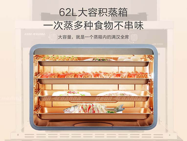 更值得一提的是,科恩智能變頻大吸力X系列集成灶除了擁有較強的油煙吸力外,還擁有5.0KW大火力,猛火直噴爆炒,熱量集中不分散,59銅火蓋設(shè)計,安全穩(wěn)定使用壽命更長。與此同時,下方還搭載了62L黃金容量蒸烤箱,一鍵智能預(yù)約,4D立體直噴蒸烤模式,受熱更均勻,頂部不滴水,智能恒溫蒸烤,多種食物蒸烤不串味,美食色澤亮麗,營養(yǎng)不流失,并配備全面高溫蒸消毒功能,讓用戶們的餐具使用更健康更安全!