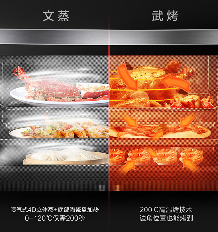 更值得一提的是,科恩智能蒸烤消一體集成灶采用4D立體直噴蒸烤模式,四面受熱更均勻,多種蒸烤模式隨心選,廣域控溫,加熱速度一提再提,熱風對流立體烘烤色香味俱全,全面喚醒食材鮮美營養。雙聚能環設計,使熱量集中不分散,熱效率更高,烹飪菜肴更美味,更節能!