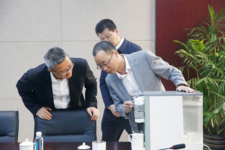 徐書記一行先后參觀科恩電器辦公環境以及大型現代化廠區,認真聽取科恩的發展歷程、研發隊伍建設、管理制度、黨建文化等情況介紹,并對公司管理、發展、品牌以及產品的高端定位予以肯定,重點對新產品研發項目科恩第四代移動水吧--“泡茶凈飲一體機”產品進行了詳細了解,無空間、無水源限制的科恩新款移動水吧,一舉顛覆了用戶對于傳統凈水設備的印象,引領行業產品革新,受到徐書記一行的高度認可,并提出做強做大的要求!