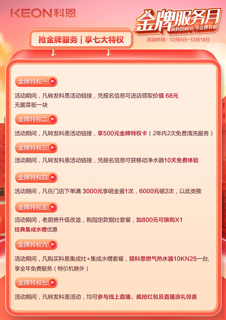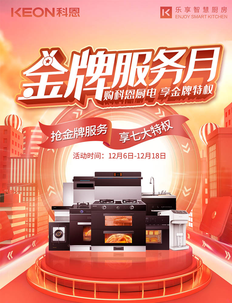 科恩“金牌服務月”經(jīng)過精心籌備盛大開啟,購科恩廚電,享金牌特權(quán)!以領(lǐng)軍者姿態(tài),開啟行業(yè)服務新典范。用戶不但可以通過科恩全國專賣店直接獲取服務,還可以通過線上報名、砍價形式獲得權(quán)益,結(jié)合線下門店金牌服務,聚焦客戶最及時服務需求,七大特權(quán)限時搶購!