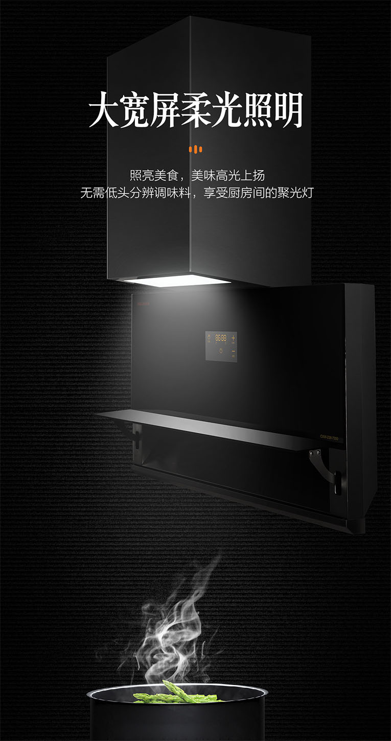 7350煙機雖然機身薄,但吸力強大,變頻電機八檔風速調節,中式八大菜系輕松搞定,一級能效標準,爆炒時刻可實現19.5±10m3/min超大風量,最大靜壓可達800Pa,在油煙未上臉之前,就被吸得一干二凈。