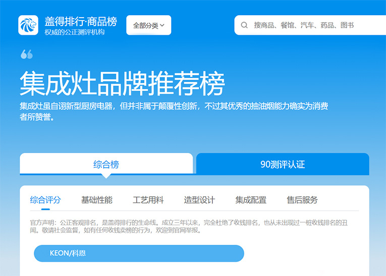 權威!科恩集成灶榮登蓋得品牌推薦榜!