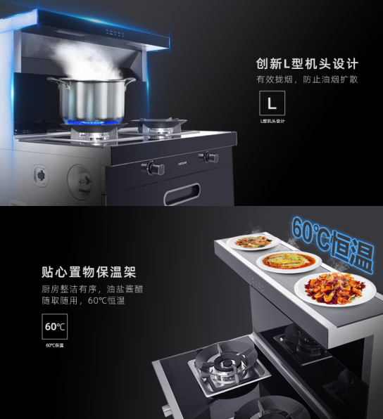 創(chuàng)新L型機頭設(shè)計,寬域攏煙,防止油煙擴散,LED節(jié)能照明燈,聚焦視線,沉浸舒適氛圍,60℃恒溫置物臺 ,從此冷菜是路人,廚房整潔有序,油鹽醬醋隨拿隨放。
