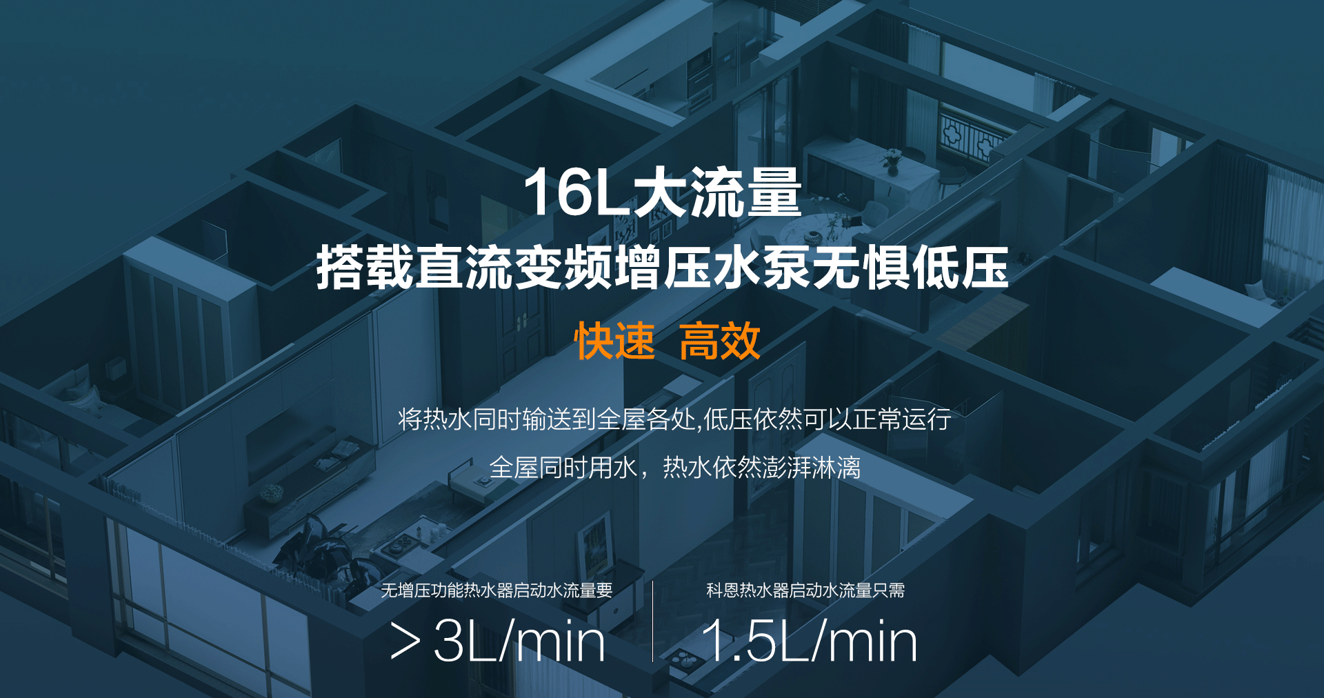 智能增壓,快速高效16L大流量搭載直流變頻增壓水泵,根據風壓智能改變轉速,將熱水同時輸送到全屋各處,低壓依然可正常運行,全屋多點用水,熱水依然澎湃淋漓,出水更快,更有效率,別墅、高層完全不帶怕的。
