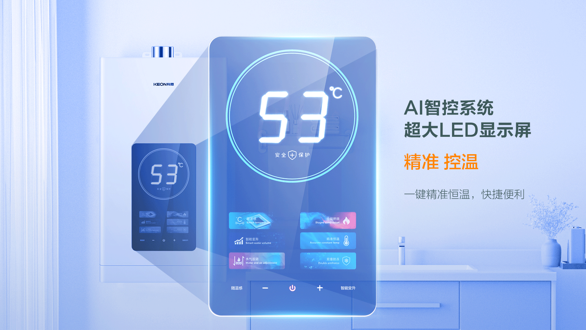 智能恒溫,告別等待:AI智控系統,超大LED顯示屏,一體化機身,耐油污、抗氧化、防變色,日常打理更省心;動感屏顯設計,美觀時尚,帶來無限視覺享受;一鍵精準恒溫,操作更簡單明了;內置燃氣穩壓裝置和水控全自動系統,保證燃燒供熱和出水量的穩定,熱水零等待,即開即來。