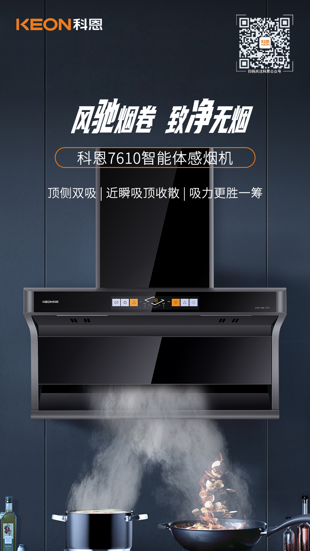 廚房有煙火,家里有溫度,科恩7610頂側(cè)雙吸平板煙機,用心呵護著柴米油鹽里的浪漫!