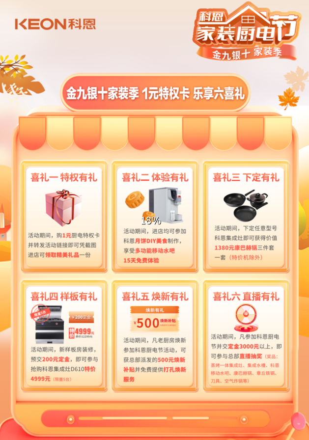 金九銀十科恩家裝廚電節(jié),1元特權(quán)卡,樂享六喜禮,還有超多精彩福利安排,這個假期等你來嗨!