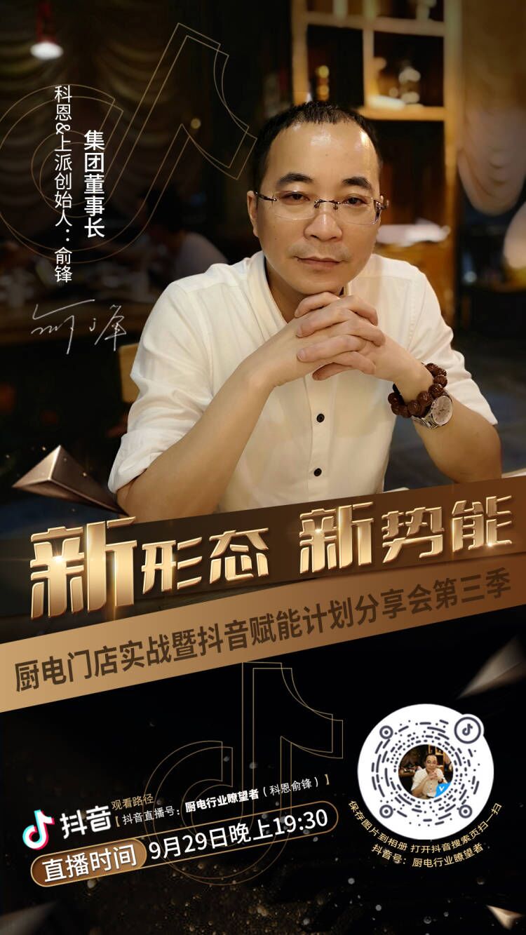 集團董事長、科恩&上派創始人俞鋒親自領軍征戰新零售流量變現風口,科恩新媒體事業中心資深團隊導師護航,助力廚電行業實體店打造線上引流線下獲客的私域裂變!9月29日19:30, 鎖定抖音直播間,董事長俞鋒親自掛帥,為您傾情分享新形態下實體店聚勢掘金新勢能!