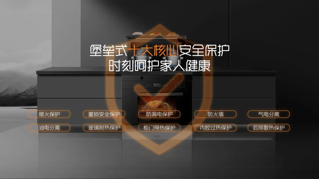 熄火保護童鎖安全保護、防漏電保護、防火墻、氣電分離、油電分離、玻璃耐熱保護、柜門隔熱保護、內腔過熱保護 、后排散熱保護。廚房安全無小事,從每個烹飪細節做起,保護廚房烹飪安全!