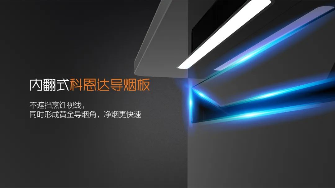 內傾科恩達導煙網板,智能開合,獨有黃金吸煙角,不擋視線,吸煙更給力,烹飪更寬敞。