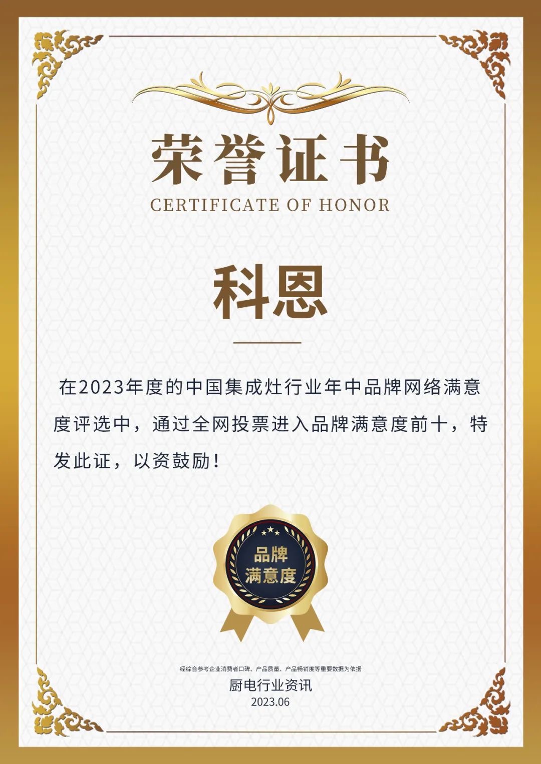 本次榮獲2023年度中國廚電行業品牌年中網絡滿意度前十”、2023年度中國集成灶行業品牌年中網絡滿意度前十”,再次印證了行業及消費者對科恩的認可,未來科恩將繼續秉持初心以產品為原點,深耕行業。以為中國家庭打造智慧廚房生活,及推動中國廚電行業發展繼續前行!