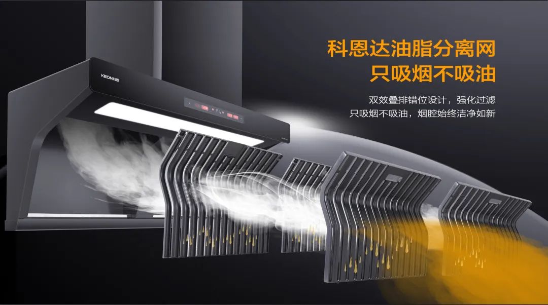 科恩免清洗煙機獨創科恩達油脂分離網,采用易潔太空壓鑄鋁材,經過酸洗-噴砂工藝加之特氟龍噴涂最后高溫燒結,不僅不沾油、易清潔更好打理。在分離油煙的同時,還能阻燃阻熱!保障廚房安全!