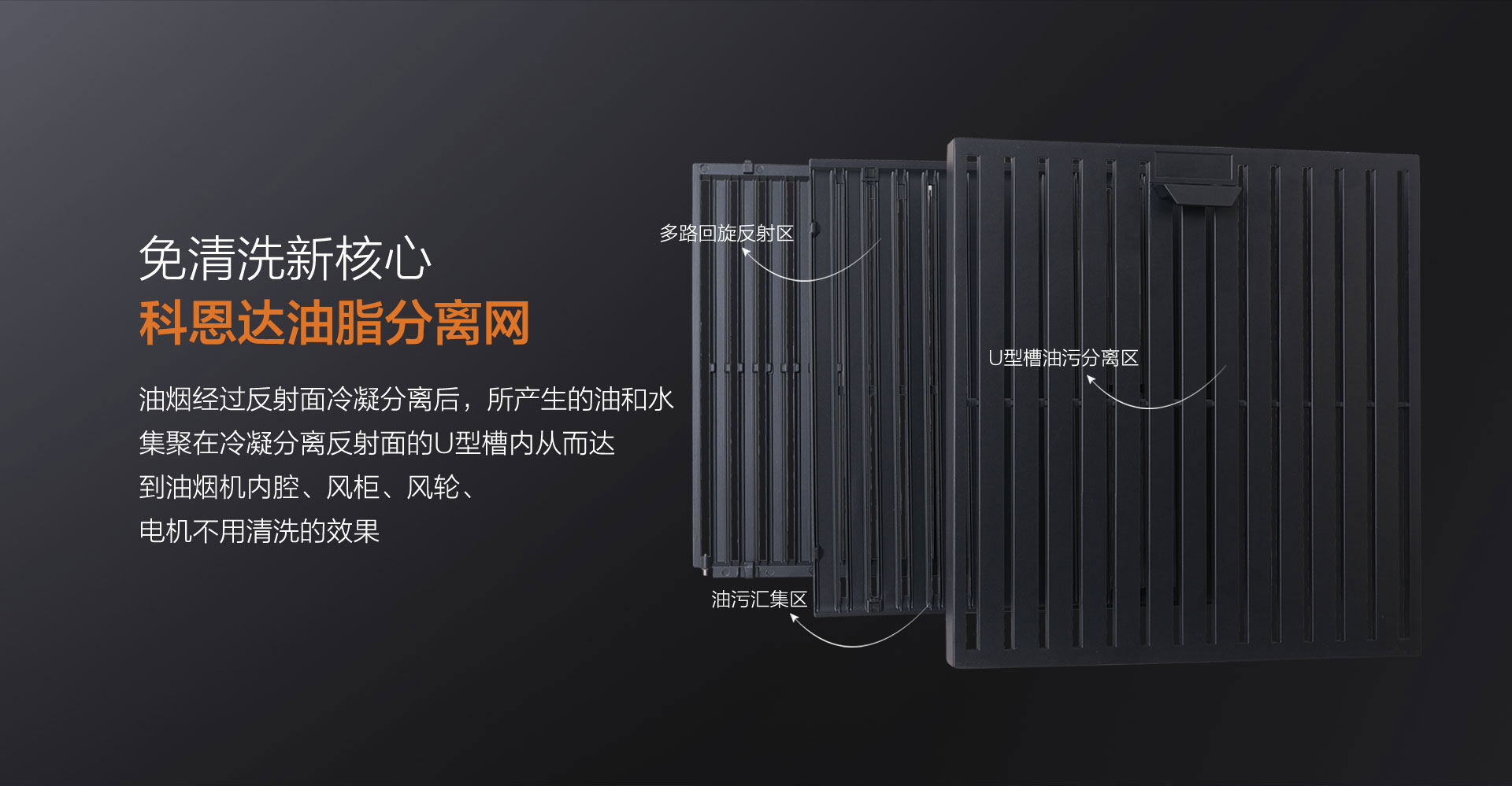科恩達油脂分離網獨創疊排天網,采用易潔太空壓鑄鋁材,搭配酸洗-噴砂工藝加之特氟龍噴涂最后高溫燒結,不僅不沾油、易清潔更好打理。在分離油煙的同時,還能防火阻燃!保障廚房安全!