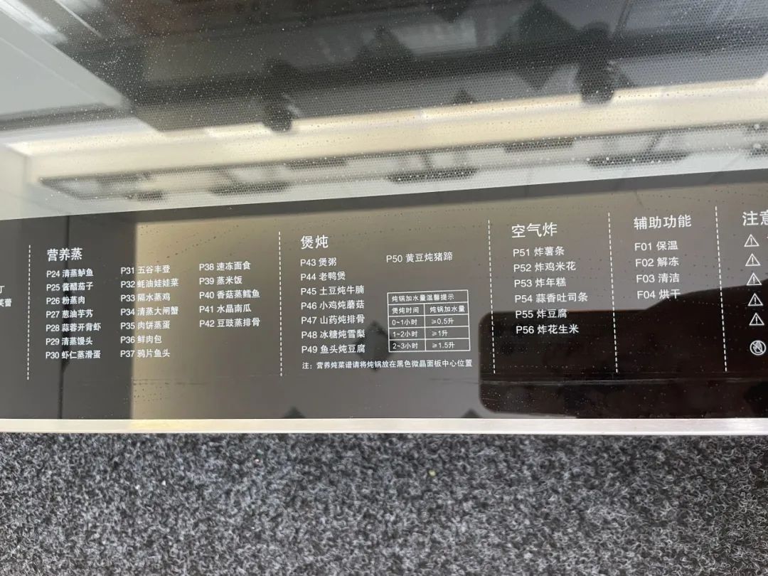 在蒸箱門板上我們能看到有56道菜肴,內置菜譜,可一鍵開啟相應的蒸烤炸燉功能,無需調節時間、溫度,即使小白也能當大廚。