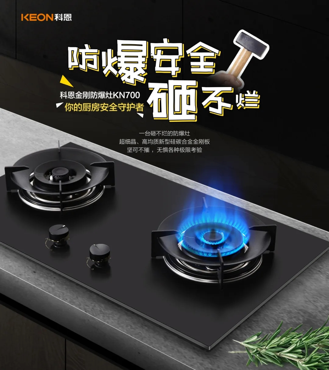 灶具則選擇了科恩KN700金剛防爆灶。近年來廚房事故頻發,灶具炸裂不再少數。因此,科恩KN700金剛防爆灶在材質上選擇了防爆金剛板,硅碳合金特種材質可耐高溫1500℃,高于國標3倍以上,更安全!在抗沖擊方面,防爆金剛板是能抗住工地大鐵錘的暴擊,真正做到0級防爆高硬度,更堅固,更安全!如此有效杜絕了廚房安全事故。