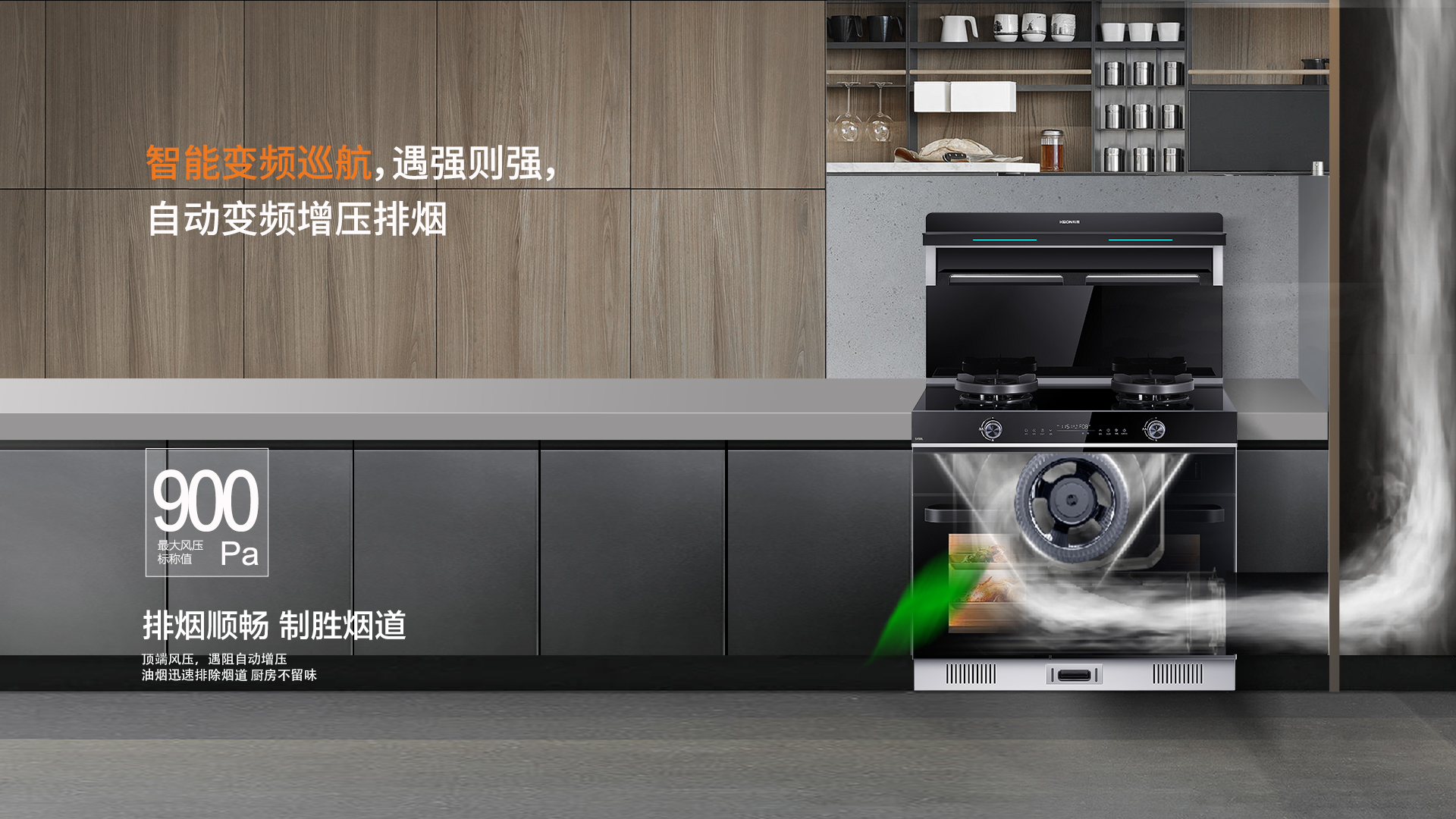 S450L蒸烤獨立集成灶風力可達23m³颶風吸力,真正實現消煙于源頭。同時,搭載智能變頻巡航功能,遇強則強,自動變頻增壓排煙,,即使做飯高峰期也能保障廚房清爽無異味。