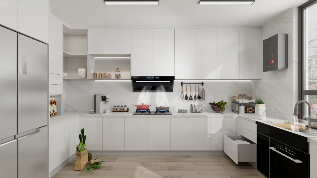 煙機(jī)方面:科恩5100歐近式超薄油煙機(jī),采用獨(dú)特的平嵌式設(shè)計(jì),完美融入櫥柜之中。具備23m³/min颶風(fēng)吸力,可瞬吸濃煙,做到辣味不嗆鼻,妝容不油膩。