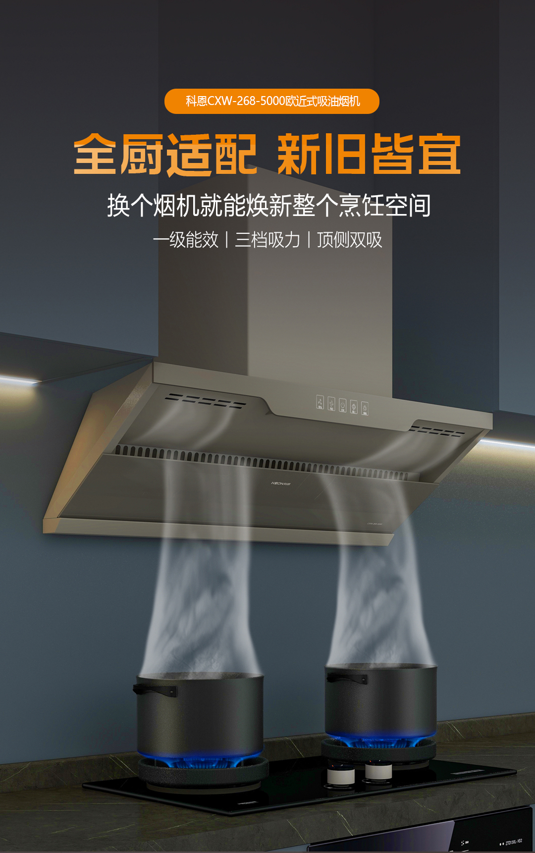 嵌入美學,颶風凈界。科恩歐近式吸油煙機5000,‌275mm纖薄機身平行嵌入櫥柜太空灰如暮色浸染,適配任意風格敞開式攏煙區擴大50%科恩爆炒時颶風瞬吸,辣味未散油煙已凈‌舊廚房的逆襲法則‌獨立安裝不挑戶型,嵌入即高級IP67LED冷光燈穿透蒸汽迷霧;兩檔吸力+爆炒模式;3分鐘延時凈煙,余味消散無蹤老破小廚房秒變開放式料理廳