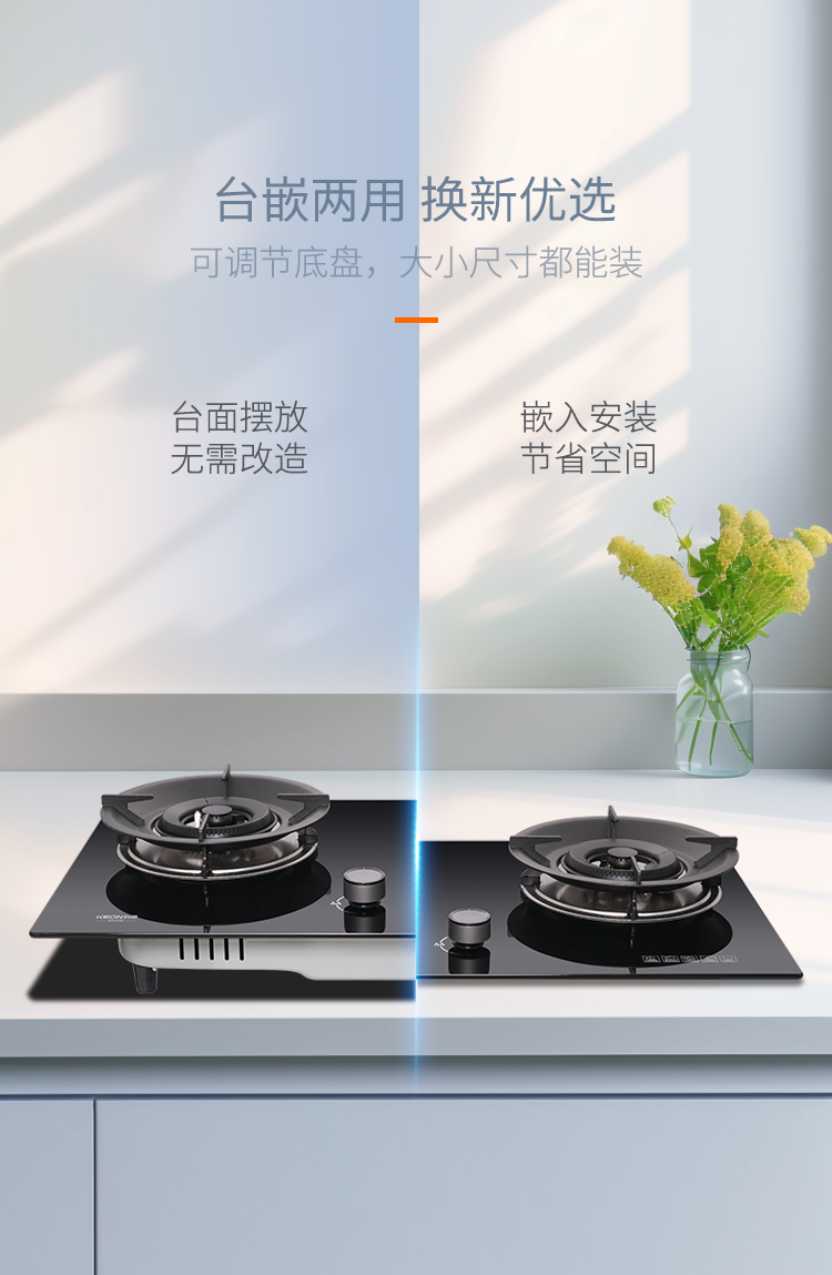 大火猛炒顯身手,小火慢燉見真功。臺面新生,輕奢主場。臺嵌雙,兼容之道,可調節底盤適配各類廚房格局。老舊灶臺退役無需改造工程,防爆鋼化玻璃面板折射高級質感。抗油抗劃傷好打理,蜂巢矩陣,清潔革命,不銹鋼湯盤筑巢式精密結構,污漬不粘不殘留,拒絕衛生死角