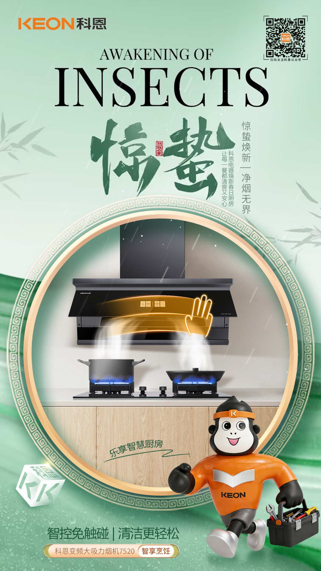 春雷啟驚蟄,煥廚正當時,科恩大吸力煙機7520,以巧裝破局,以強吸凈味,以智能省心,一灶春風,一室清新,讓廚房告別油煙困擾,讓烹飪回歸自在從容。驚蟄煥新,選科恩7520,凈享健康無煙,悅啟春日美好廚居生活!