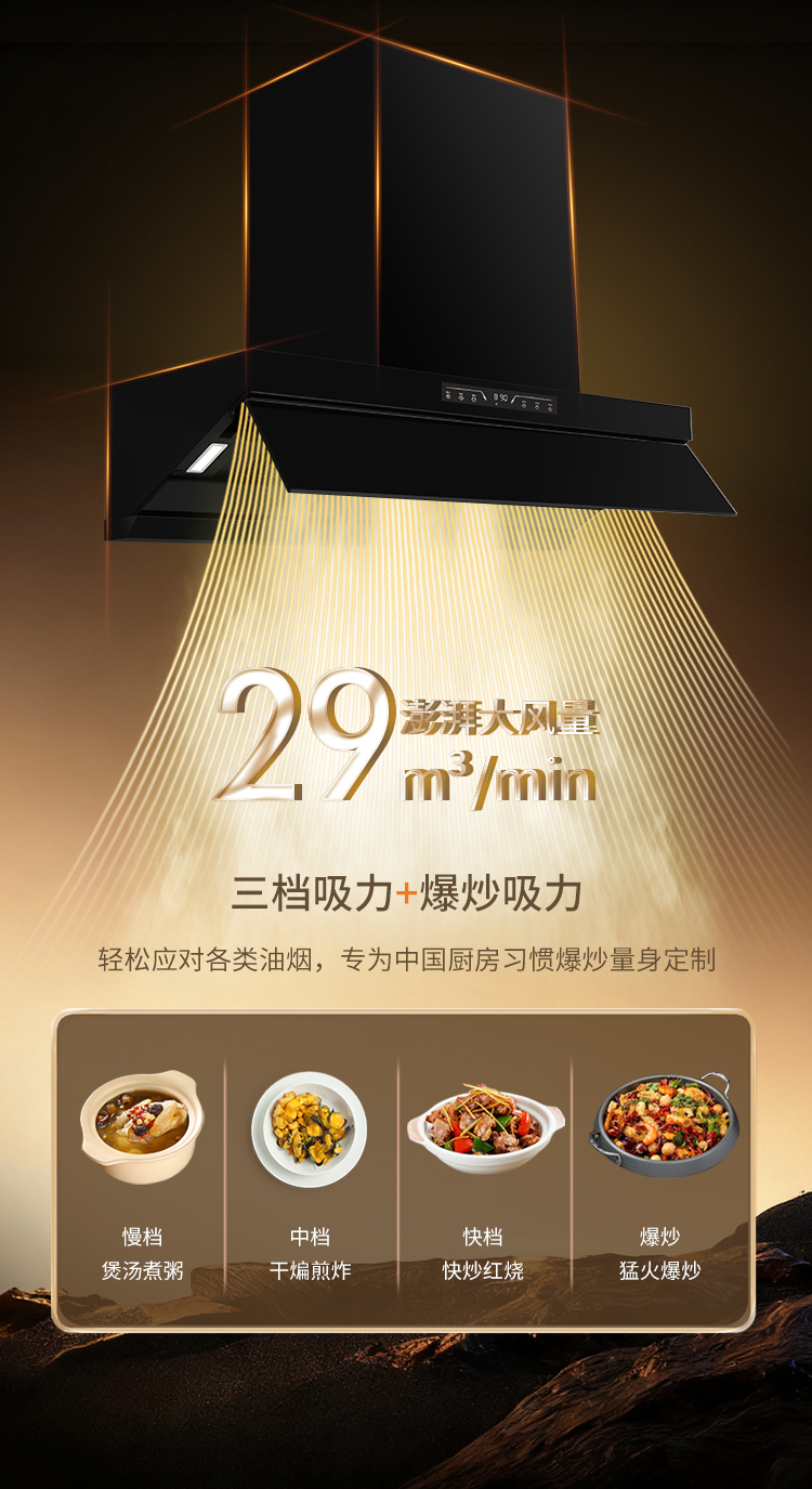 勁風攬煙凈無痕跡想爆炒香椿的鮮香慢燉春筍的清甜?29m³/min澎湃大吸力,濃煙剛起即吸1200Pa超強靜壓,突破煙道擁堵直流變頻電機遇強則強烹飪全程空氣清爽,告別油膩侵擾