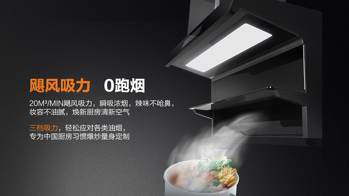 • 獨特黃金吸煙角,二次冷凝板內傾設計,油煙不過臉