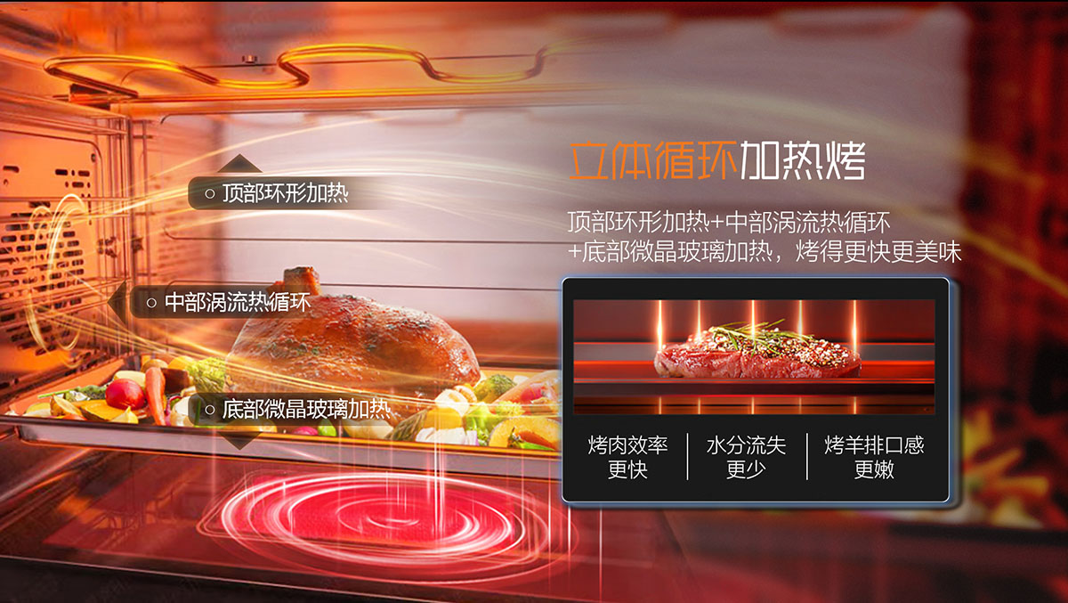 • 頂部環形加熱+中部渦流熱循環+底部微晶玻璃加熱,烤得更快更美味