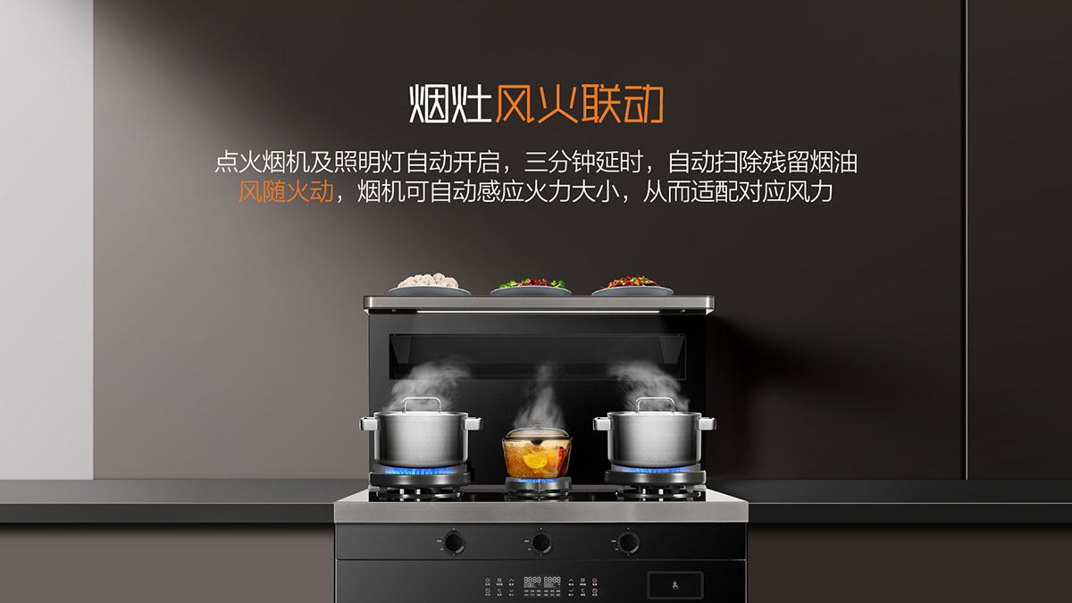 • 煙灶風火聯動,點火煙機及照明燈自動開啟,風量隨火力大小自動調節