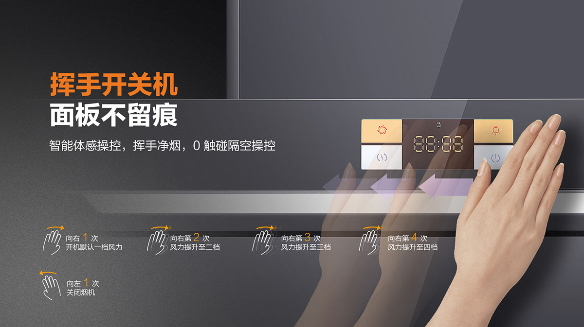 • 智能體感,0觸碰隔空操控,揮手凈煙