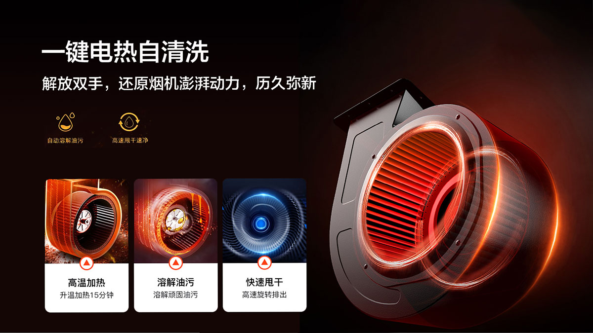 • 一鍵電熱自清洗,解放雙手,還原煙機澎湃動力,歷久彌新