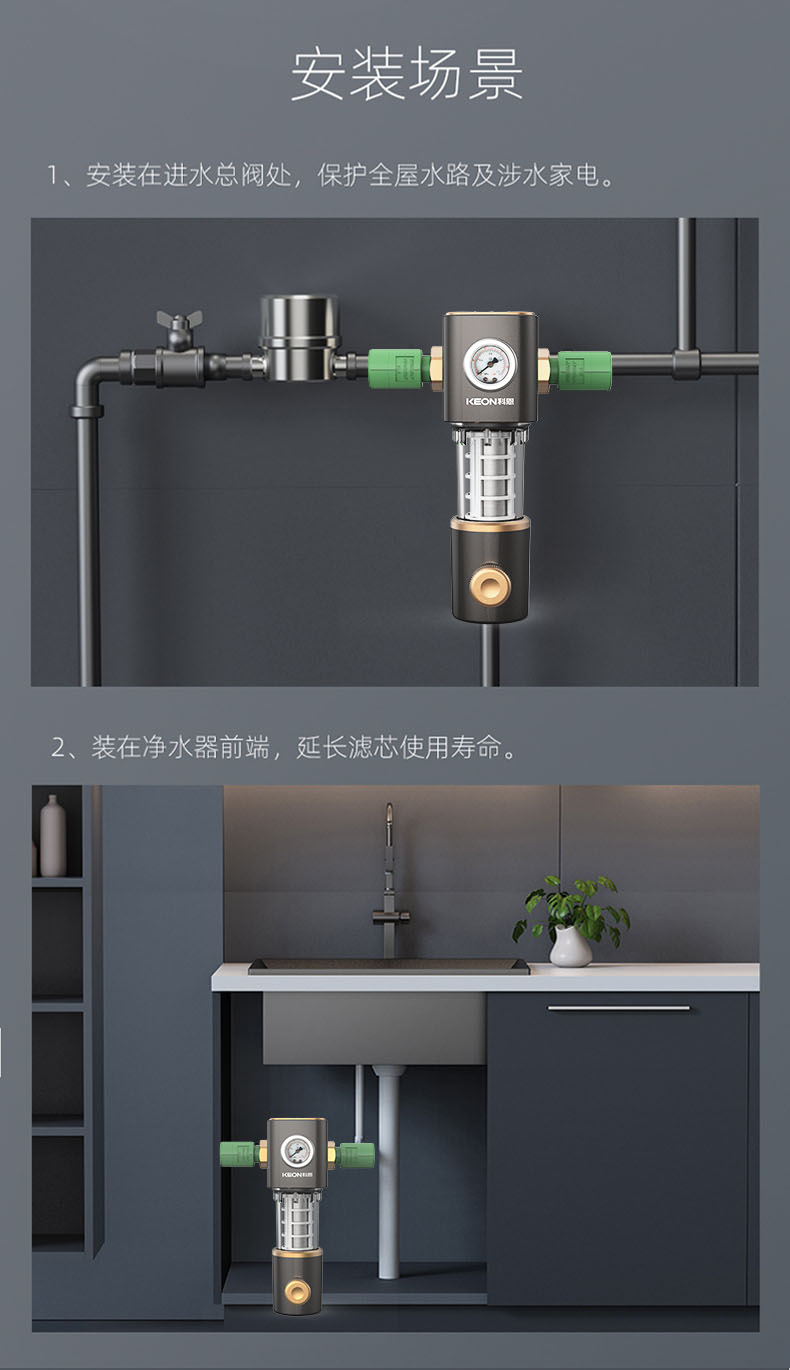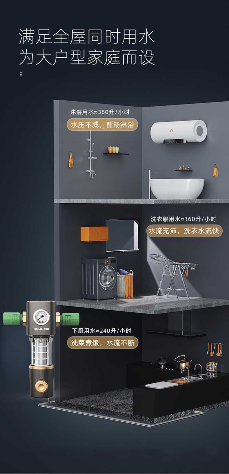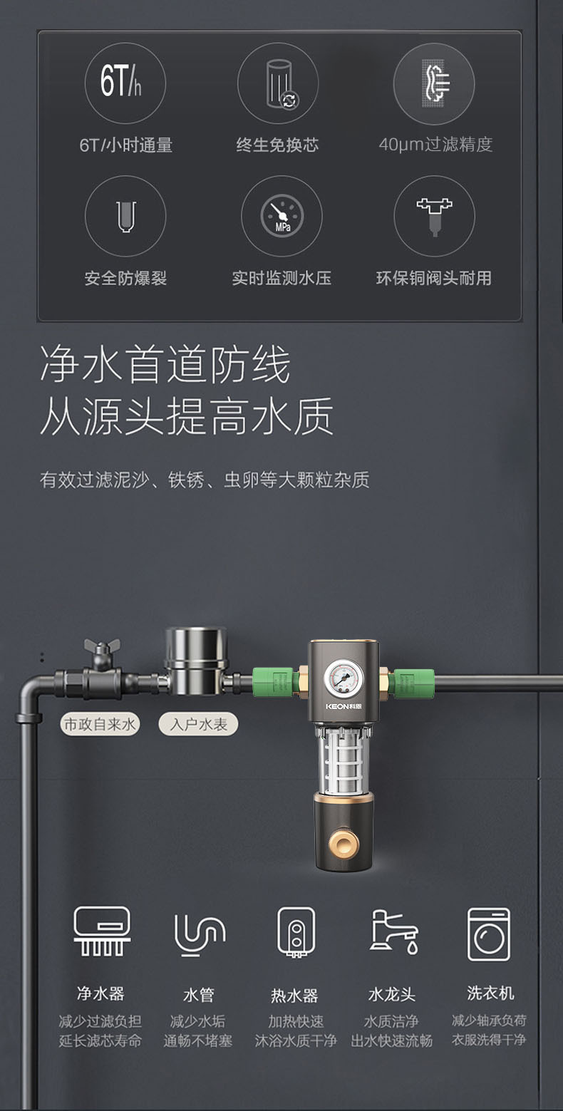 • 6噸/小時大流量,快速過濾,全屋用水無壓力