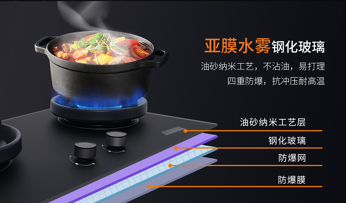 • 亞膜水霧鋼化玻璃,油砂納米工藝,不沾油,易打理