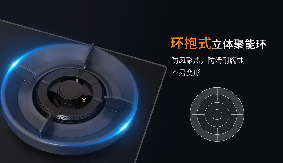 • 環(huán)抱式立體聚能環(huán),防風(fēng)聚熱,提升熱效