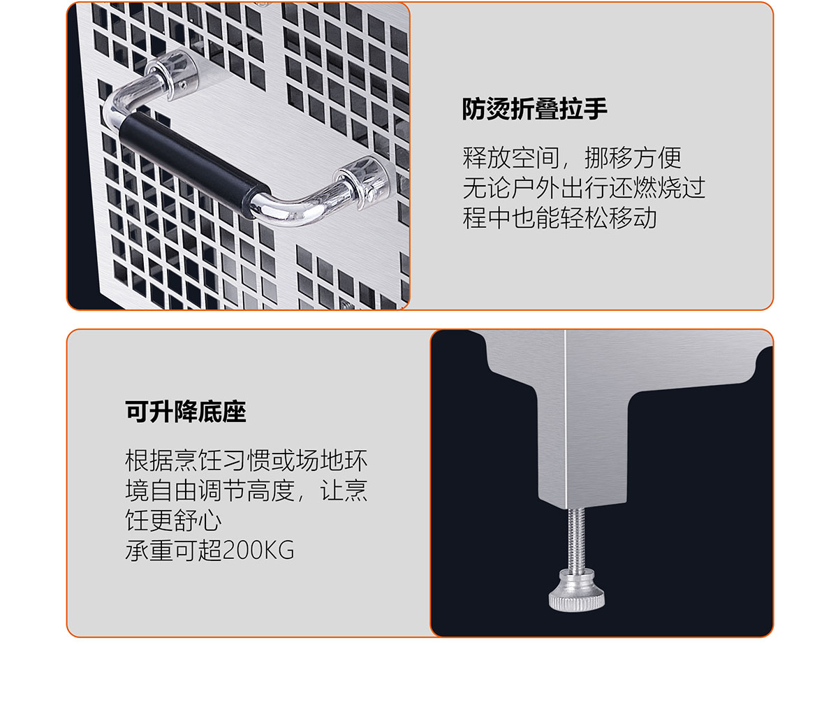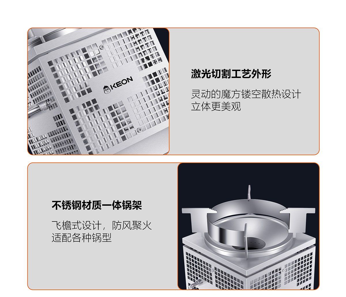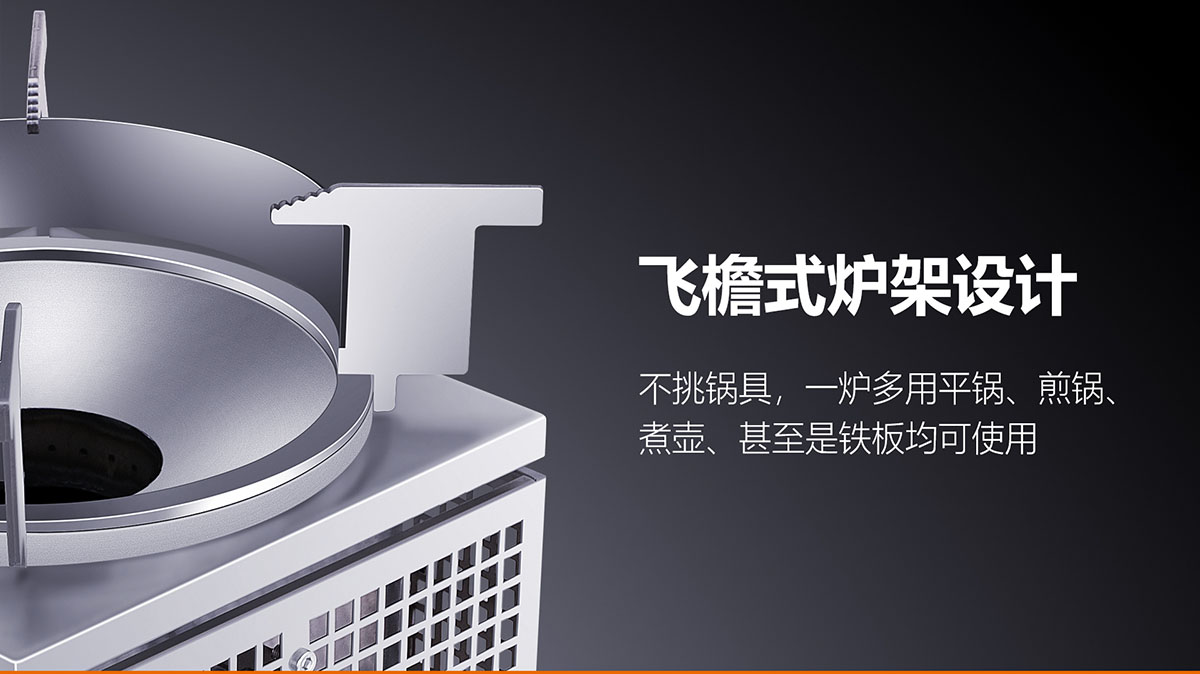 • 飛檐式防滑鍋架,堅固耐用,聚熱安全
