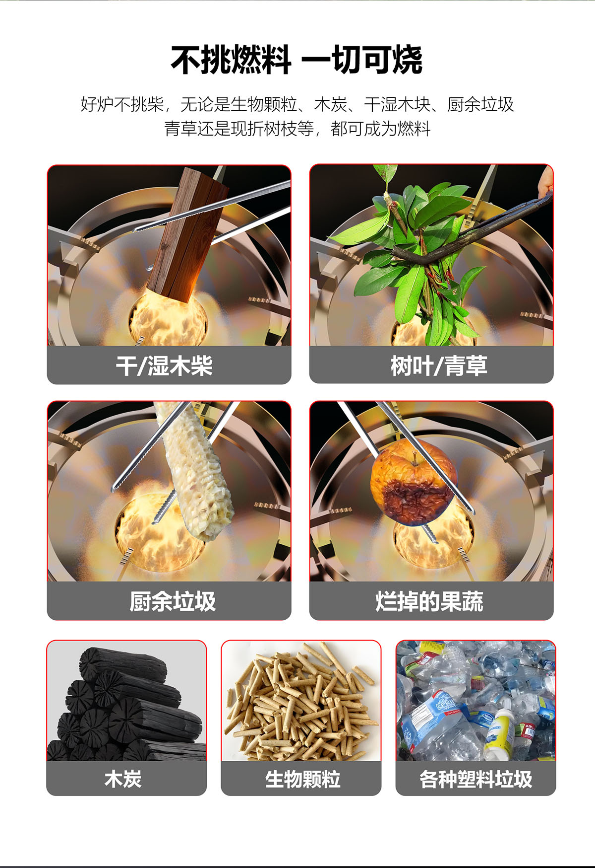 • 好爐不挑柴,一切固體皆可燃燒